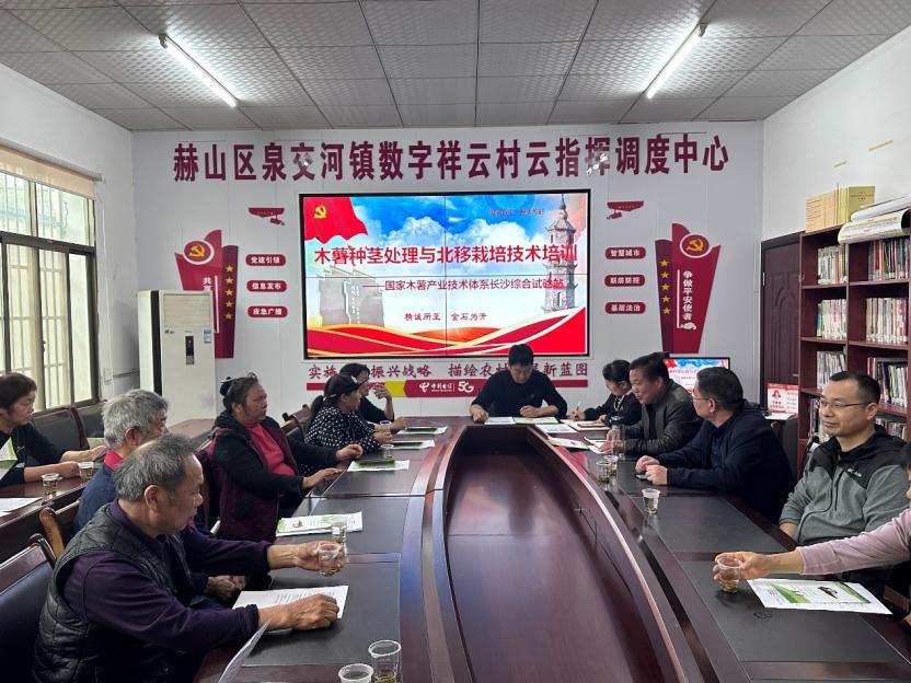 祥云村地处湖南省益阳市泉交河镇,近年来因地制宜发展木薯特色产业。在村党群服务中心,宋勇以“木薯种茎处理与北移栽培技术”为题开展培训,基于团队多年科研成效,聚焦木薯北移高效种植、病虫草害绿色防控及木薯综合利用等核心技术,结合本土化种植实例进行系统地讲解。培训现场同步发放《木薯标准化种植手册》《木薯种茎处理防灾减灾技术》《木薯栽培技术要点》等技术资料,通过“技术图解+步骤分解”的可视化呈现,将科研成果转化为可复制的生产规范,让参训农户真正掌握“学得会、用得上”的实用技能。