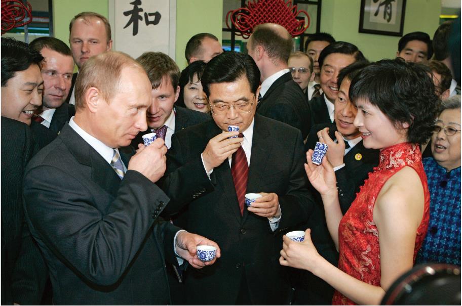 1994届茶学校友孙燕南在俄罗斯中国年活动上向两位国家元首献茶